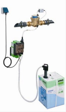 Elektronisch gesteuerte, mengenpropor- tional und stufenlos regelbare Dosier- anlage (voreingestellt und verplombt)zur Dosierung von EXADOS-Wirkstoffen aus Transportkanistern in Trink- und Brauch- Wasser. Bauart und Betrieb entsprechend DIN 19635, - DVGW-zertifiziert - bestehend aus: 1 Dosierpumpe Typ GP 2/40 (verplombt) als selbstansaugende und gegen Druck selbstentlüftende Membranpumpe mit Synchronmotor, Befestigungskonsole für Wand-, Boden- oder Behältermontage mit auswechselbarer Elektronikkassette, Anzeigen für Betrieb, Leermeldung, Membranbruch und Dosierüberwachung umschaltbar von Eigen- auf Wasserzäh- lersteuerung Eingang für externe po- tentialfreie Fremdansteuerung mit potentialfreier Störmeldung. 1 Wasserzähler mit Impulsgeber, Impuls- kabel zur Pumpenelektronik und An- schlussverschraubungen R 1" 1 Sauglanze für Transportdosierbehälter 10 kg und 20 kg 1 Impfventil 1 Dosierleitung 1,5 m Technische Daten: Impfanschluss : R 1/4" Anschluss d. Wasserzählers: R 1 1/4" Durchfluss max.: 10,0 CM/h Druckverlust : 0,8 bar Einbaulänge Wasserzähler : 190 mm Einbaulänge m. Verschraub.: 280 mm Impulsfolge Wasserzähler : 0,5 l/Imp. Saughöhe max.: 1,5 m WS Betriebsdruck max.: 10 bar Wassertemperatur max.: 30 Grad C Stromanschluss : 230 V, 50/60 Hz Leistungsaufnahme : 18/21 W Schutzart/Isolationsklasse: IP 54 Pumpe einschließlich 1,7 m Stroman- schlusskabel mit Schukostecker Fabrikat: Grünbeck - 5