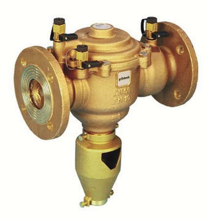 Nach DIN 1988, Teil 4 sind Trinkwasser-leitungen durch Einbau eines Rohr-/Systemtrenners abzusichern, um das Zu-rückfließen von Nichttrinkwasser zu ver-hindern, falls die Gefahr einer Beein-trächtigung oder Gefährdung besteht.- DVGW-zertifiziert -Ausführung:Systemtrenner Bauart BA nach dem Drei-kammernsystemEinsatzbereich: bis Gefahrenklasse 4gemäß DIN 1988, Teil 4.Systemtrenner komplett mit Gehäuse ausRotguss, Anschlussflansch nach DIN 2533,2 Rückschlagventile, 3 Manometeran-schlüsse für Vor-, Mittel- und Nach-druckzone, Tropfwasseranschluss, ein-schließlich Bedienungsanleitung.Technische Daten:Anschlussflansch : 50 DNDurchfluss max. : 25 CM/hKv-Wert : 35 CM/hAnsprechdruck : autom. EinstellungNenndruck : 10 bar (Ü)Betriebstemp. max.: 65 Grad CTropfwasseranschluss: 112 mmBetriebsgewicht ca.: 19,4 kgEinbaulänge ohneGegenflansch : 302 mmWandabstandab Rohrmitte : 140 mmFabrikat: Grünbeck - 5