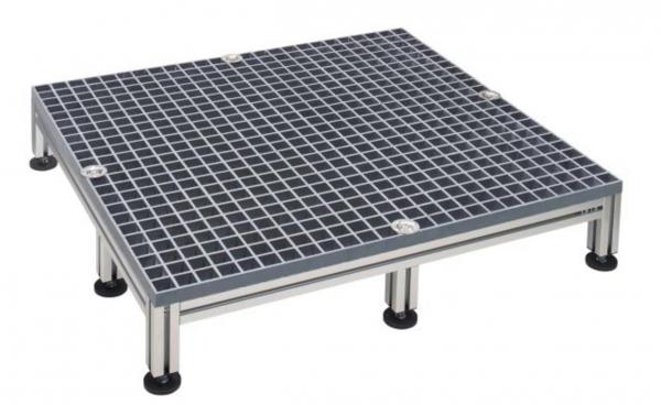 zur einfachen und montagefreundlichen Aufnahme und Befestigung der Dreifach- Enthärtungsanlage bestehend aus - Alu-Rahmengestell als Systemträgerge- stell aus eloxiertem-Aluminiumprofil - GFK-Gitterrost zur Platzierung der Delta-p-Enthärtungsanlage - verstellbaren Stellfüssen zum Aus- gleich von Bodenunregelmäßigkeiten Abmessungen (LxBxH) ca: 770x770x185 mm - 5